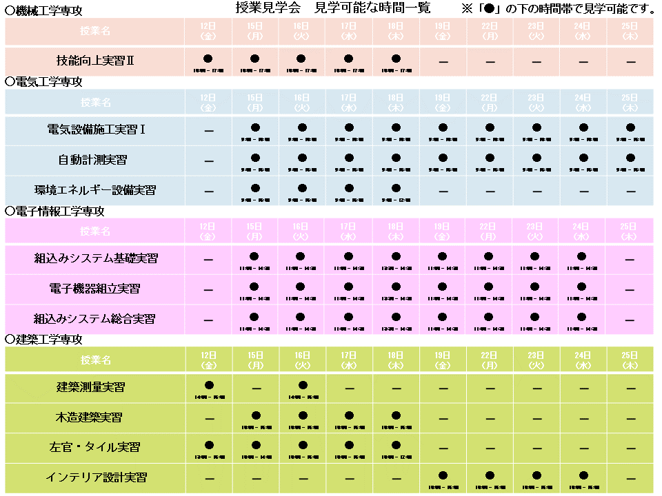 授業見学の対象となる授業及び見学可能な時間帯は以下のとおりです。