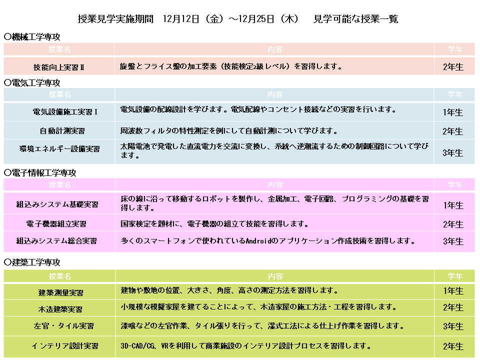 授業見学会(2025年12月12日(金)~12月25日(木))