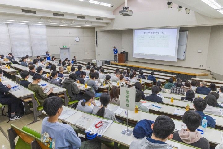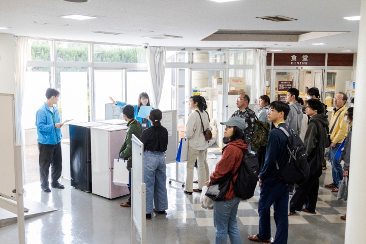 各専攻の実習場を教員や学生スタッフの説明を受けながら巡ります。当日は機械工学専攻、電気工学専攻、電子情報工学専攻、建築工学専攻の内2つの専攻まで参加が可能です。