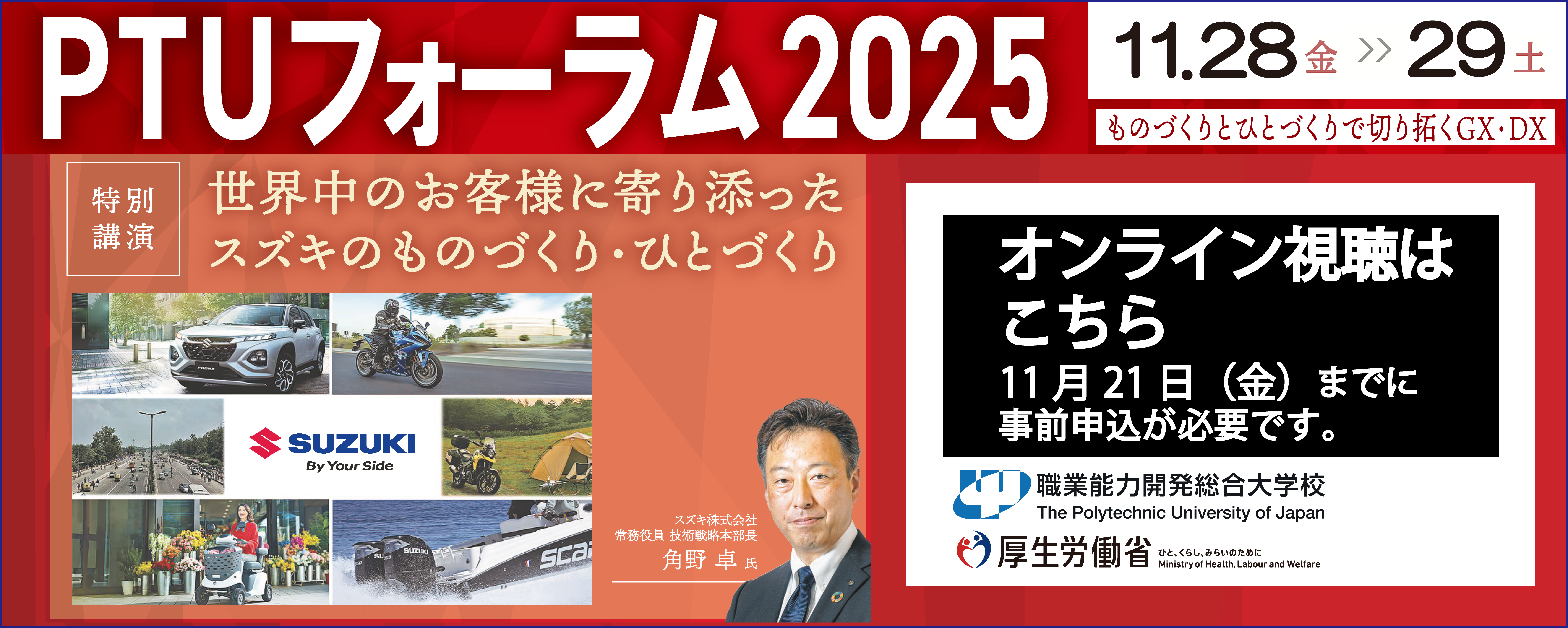 職業能力開発総合大学校(PTU:The Polytechnic University of Japan)では「ものづくりとひとづくりで切り拓くGX・DX」というテーマのもと、職業能力開発に関する研究成果及び職業訓練事例の発表と交流の場の提供を目的として、PTUフォーラム2025を開催します。